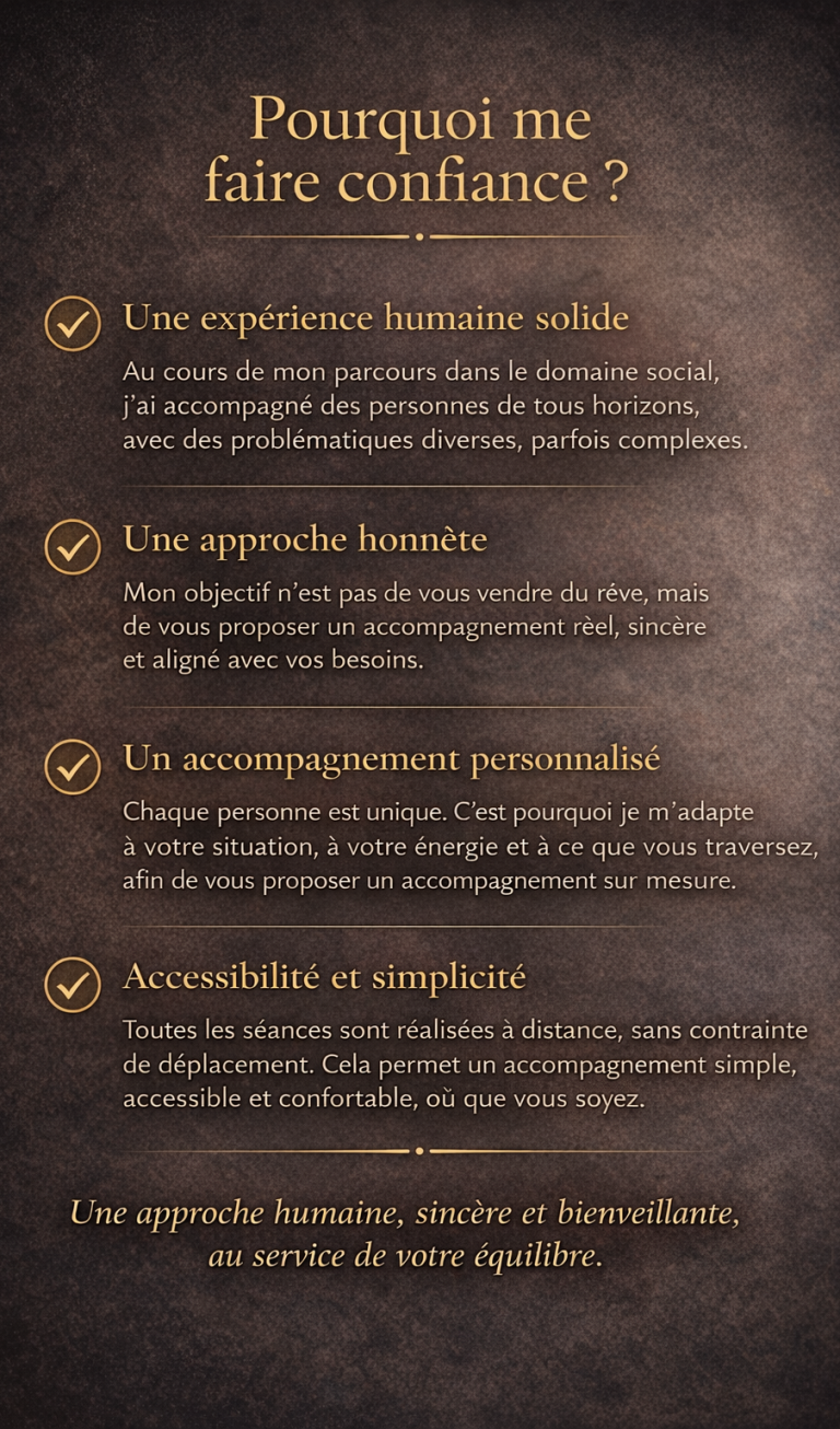 Je ne promets pas de résultats “magiques”, mais un travail sincère, une écoute réelle et une intention profonde de vous aider à retrouver apaisement, clarté et équilibre.